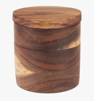 Pyöreä säilytysrasia kannella, akaasiapuuta. Pienempi säilytysrasia, jolla on monia käyttötarkoituksia samalla ollen mukava sisustusyksityiskohta.